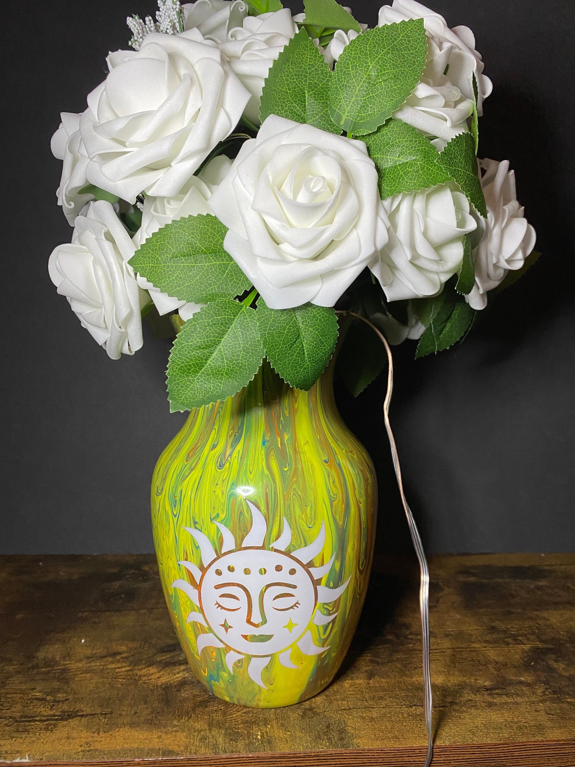The Vase is Paint Poured with Acrylic paint, and then coated with resin. It has three different colors in the vase, yellow ,blue ,or